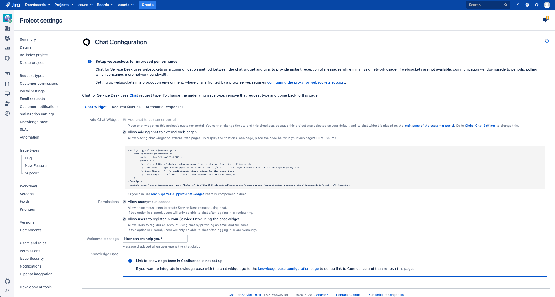 - Go to the Project settings. You will find a new entry called Configure chat. From the Request Type drop-down menu, select the issue type (for example Incident) and click on the Create Request Type button.