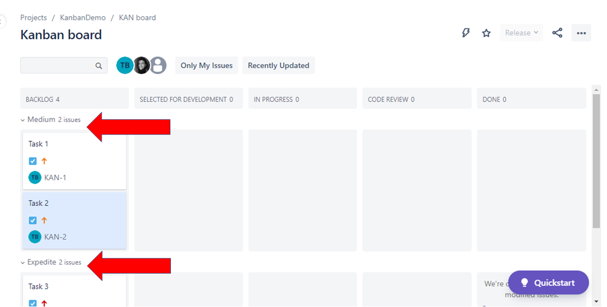 By default, issues of “Highest” priority are categorized under the “Expedite” swimlane. All the others fall under “Everything Else”.