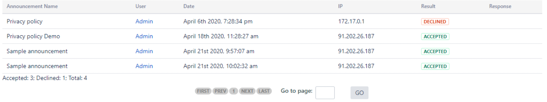 This module is designed to manage user consents. Use this to collect privacy policy consents and inform users about data storage as well as updates or maintenance.